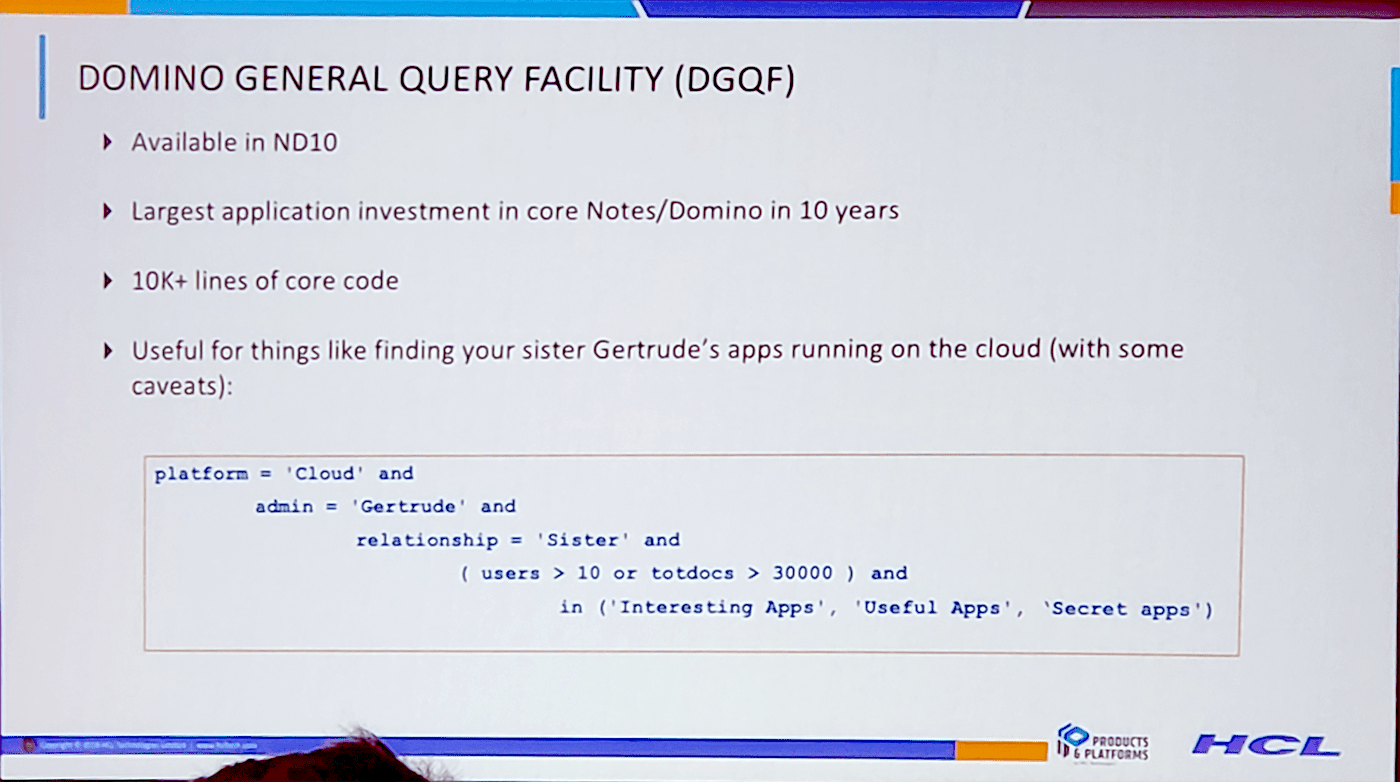 Domino General Query Facilty (DGQF) je překvapivou novinkou, která bude již ve verzi 10. Jedná se o největší investici do jádra Notes/Domino za posledních 10 let. DGQF je silný dotazovací jazyk navržený speciálně pro Domino NoSQL databáze. Dokumenty půjde vyhledávat podobně jako v XPath nebo GraphQL, ale syntaxe je samozřejmě přizpůsobena Lotuscriptu. Pokud se vám zkratka DGQF zdá hrozná, asi nejste sami – mezitím došlo k přejmenování na Domino Query Language (DQL).