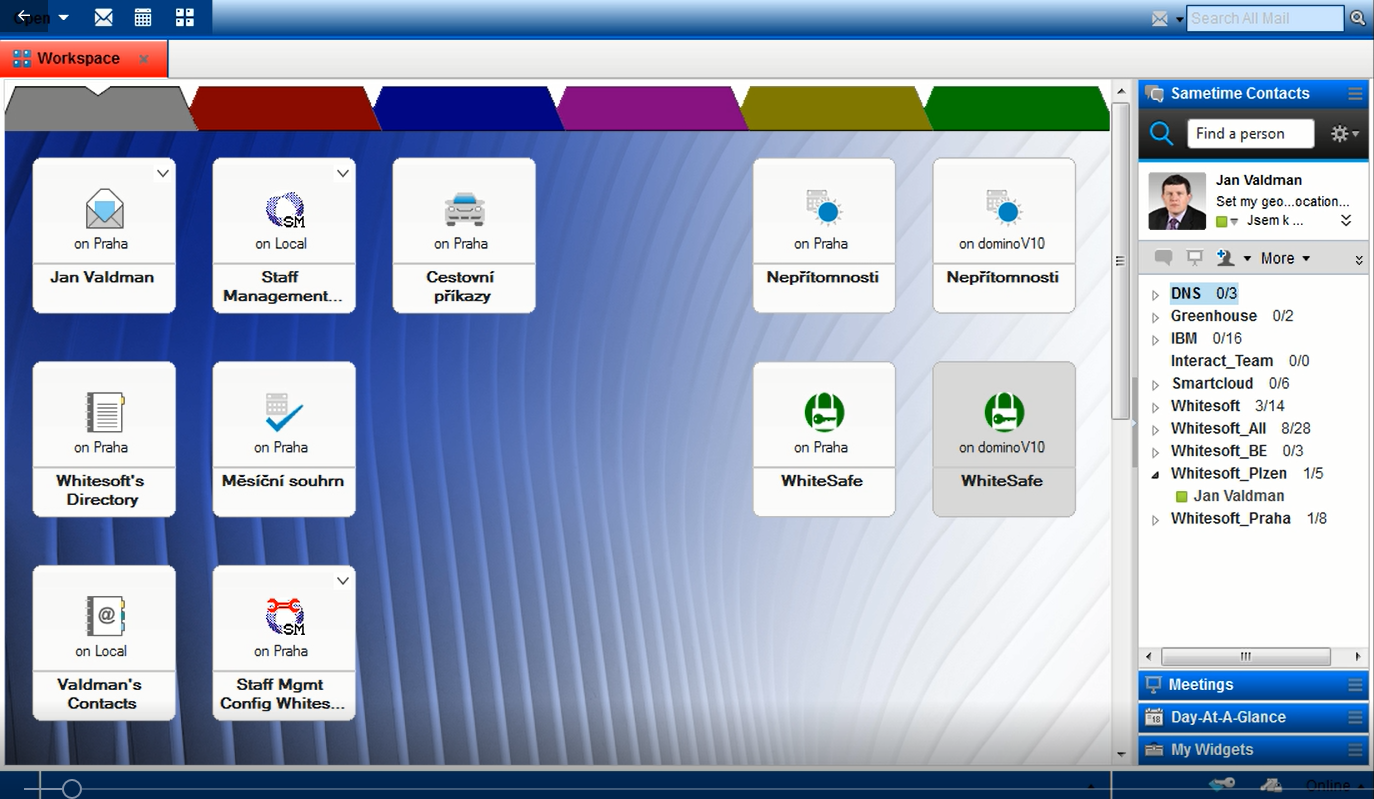 Jak již víte z předchozích příspěvku v našem blogu, čeká nás asi 25 různých novinek, které se týkají administace, vývoje aplikací i každodeního používání Notes. Na obrázcích a videu níže si můžete prohlédnout přebarveného klienta Notes 10 (jedna z nových funkcí), který otevírá aplikace Nepřítomnosti a WhiteSafe z z na serveru Domino 10.