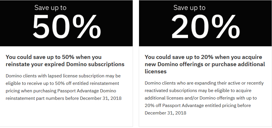 Nyní je ideální doba na dokoupení chybějících licencí IBM Notes/Domino nebo obnovení podpory. Při příležitosti vydání Domino V10 nabízí IBM mimořádné slevy na obnovení softwarové podpory (S&S reinstatement) nebo na rozšíření počtu licencí.